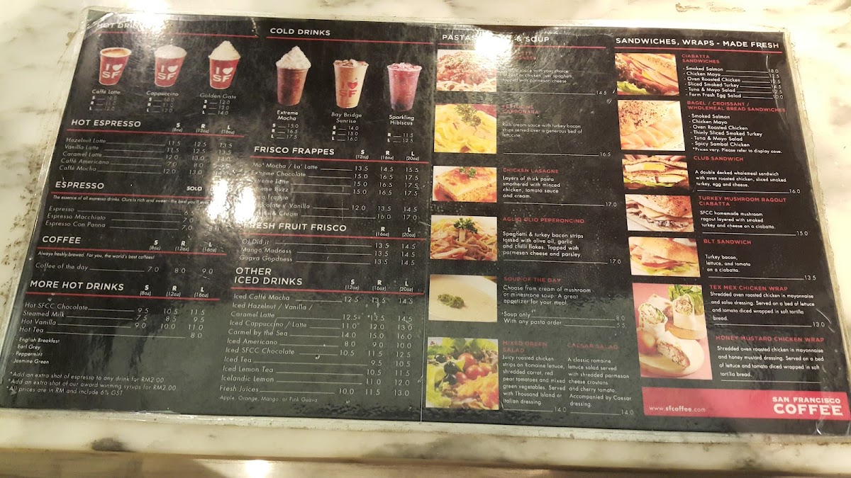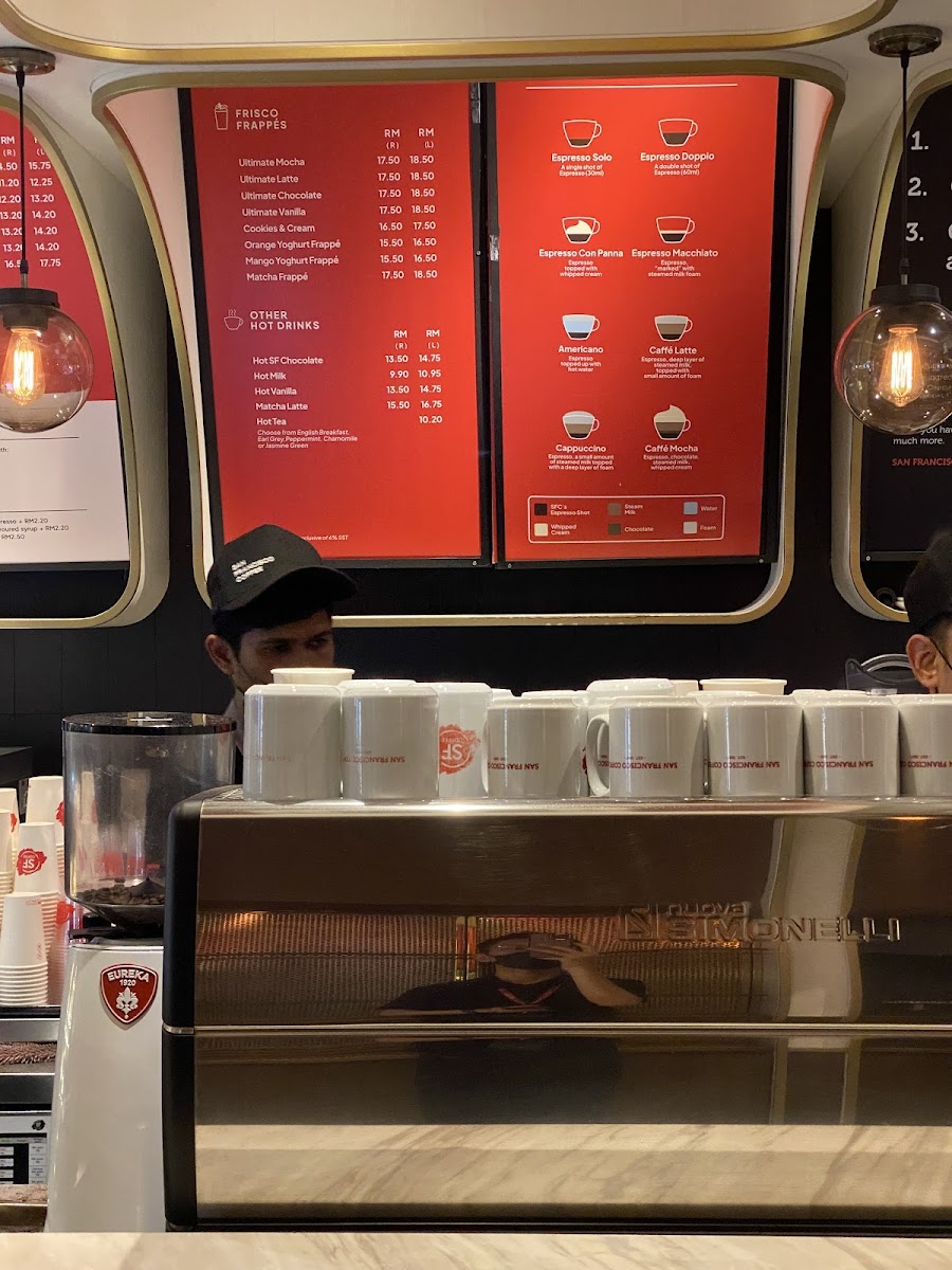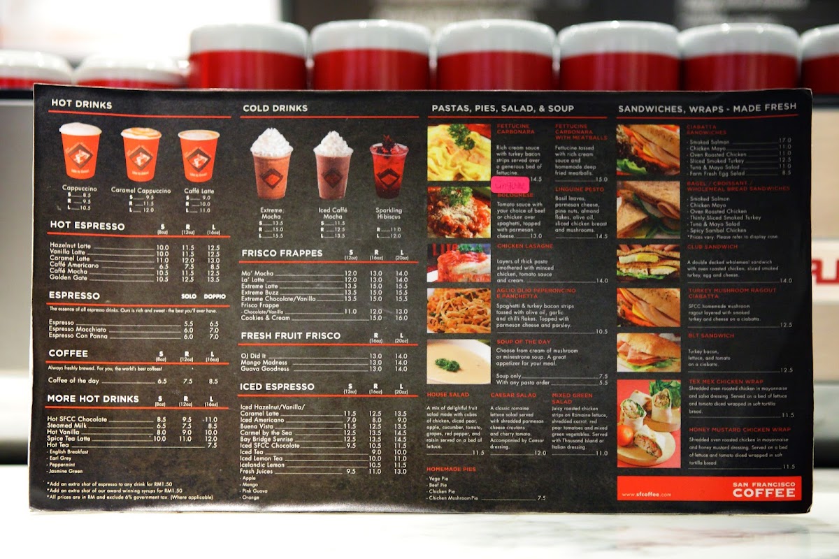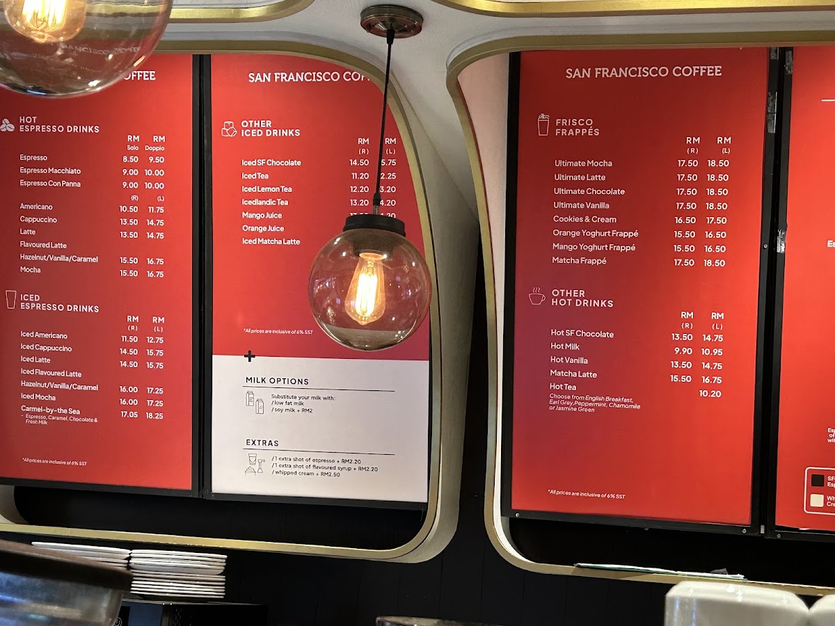 Step into the cozy ambiance of San Francisco Coffee Suria KLCC, located at Lot 205 Level 2, Petronas Twin Tower, in the heart of Kuala Lumpur. Whether you're catching up with friends or taking a break from shopping, this café is the perfect spot to enjoy a great cup of coffee. The San Francisco Coffee Suria KLCC Menu offers a wide selection of freshly brewed coffees, delicious pastries, and a range of light bites that are perfect for any time of the day. From creamy lattes to rich espressos, each cup is made with expertly sourced beans, ensuring a smooth and flavorful experience. Whether you're craving a light snack or a hearty meal, you'll find something that suits your taste. With its convenient location and relaxed vibe, it's a must-visit for coffee lovers and food enthusiasts alike.